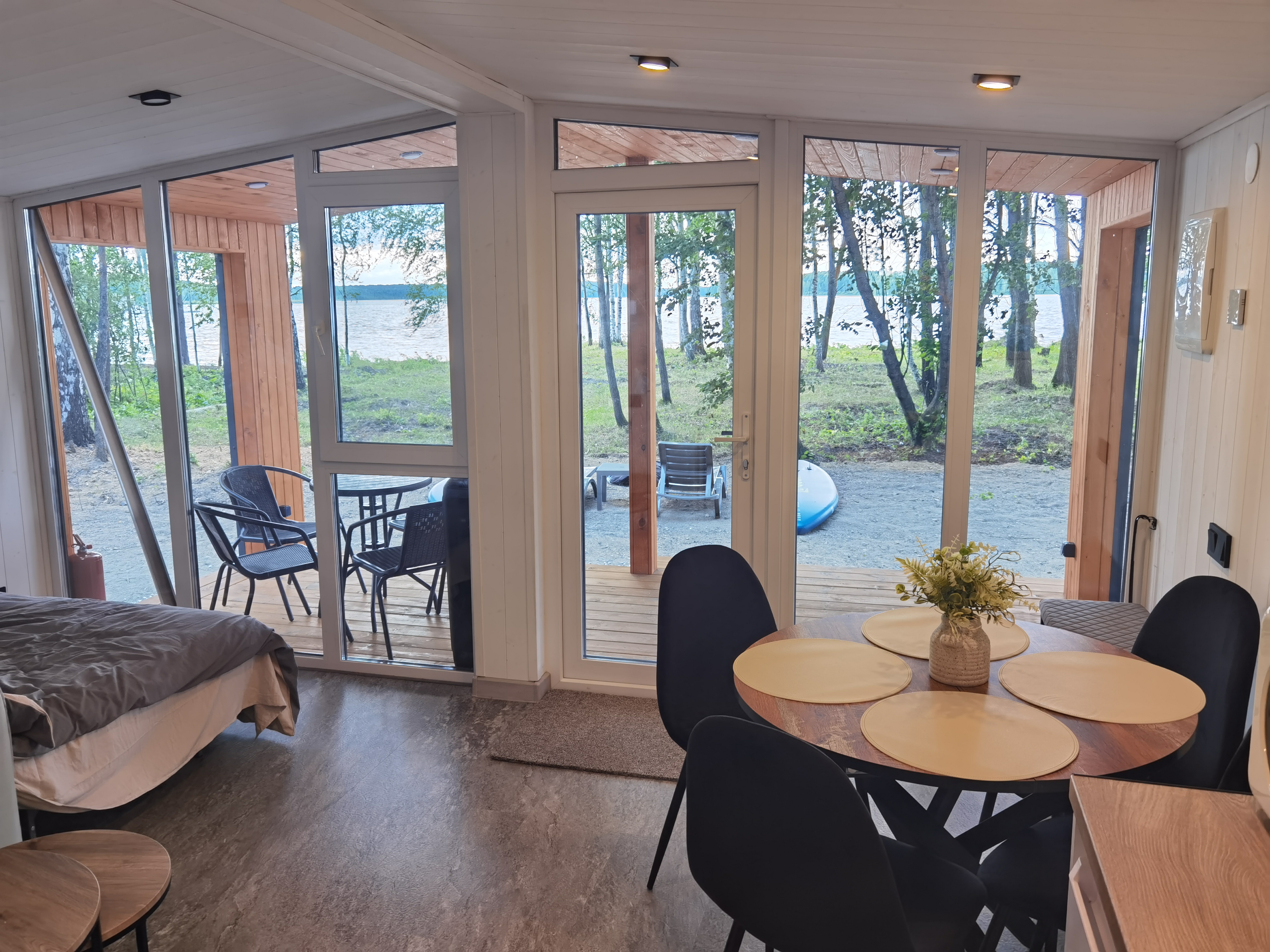 ПВХ с ламинацией снаружи, внутри белый профиль. Стеклопакеты из энергосберегающего стекла. Двери межкомнатные из закаленного стекла, цвет бронза.